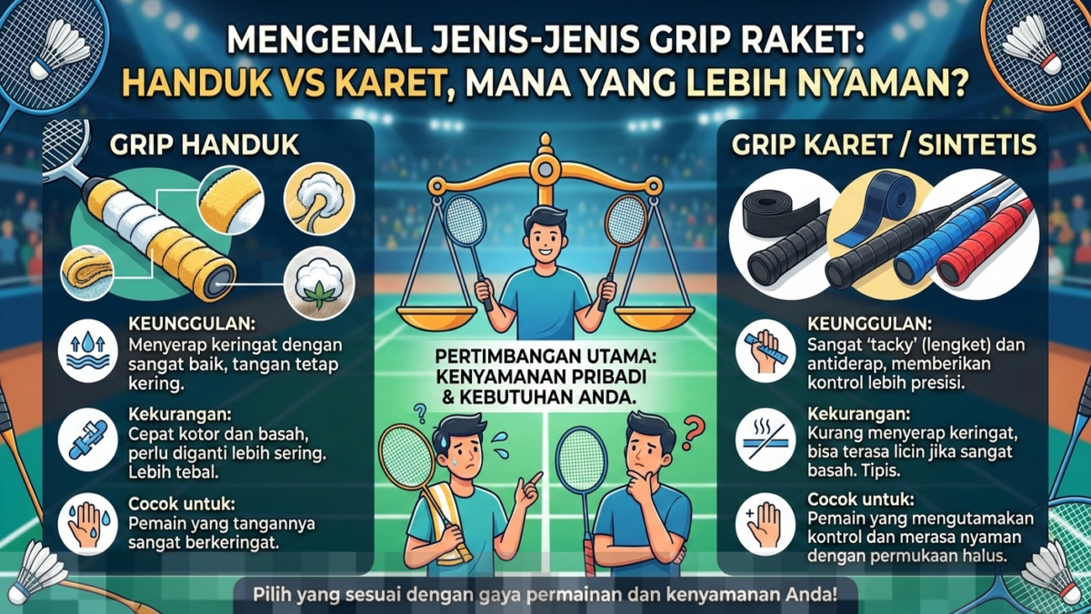 Grip raket memiliki peran yang sangat penting dalam menentukan tingkat kenyamanan dan kontrol saat bermain. Dengan memahami perbedaan antara grip handuk dan grip karet, pemain dapat membuat pilihan yang lebih baik sesuai dengan karakteristik dan kebutuhan mereka. Dalam dunia olahraga, detail kecil seperti grip ini dapat membuat perbedaan besar dalam performa permainan.